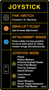 Above: This decal, located in the cab of every MT7 tractor, displays the pre-programmed joystick functions that correspond with various attachments depending on the selected joystick mode.
