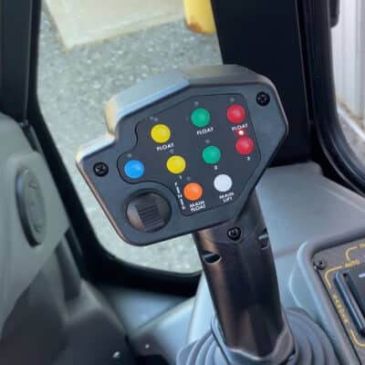 Additionally, pressing the yellow, green, or red hydraulic circuit float button allows the current attachment to float. This feature lets fluid flow freely from one side of the circuit to the other at a restricted rate and is also used for hooking and unhooking attachments by releasing pressure on the hydraulic lines.
