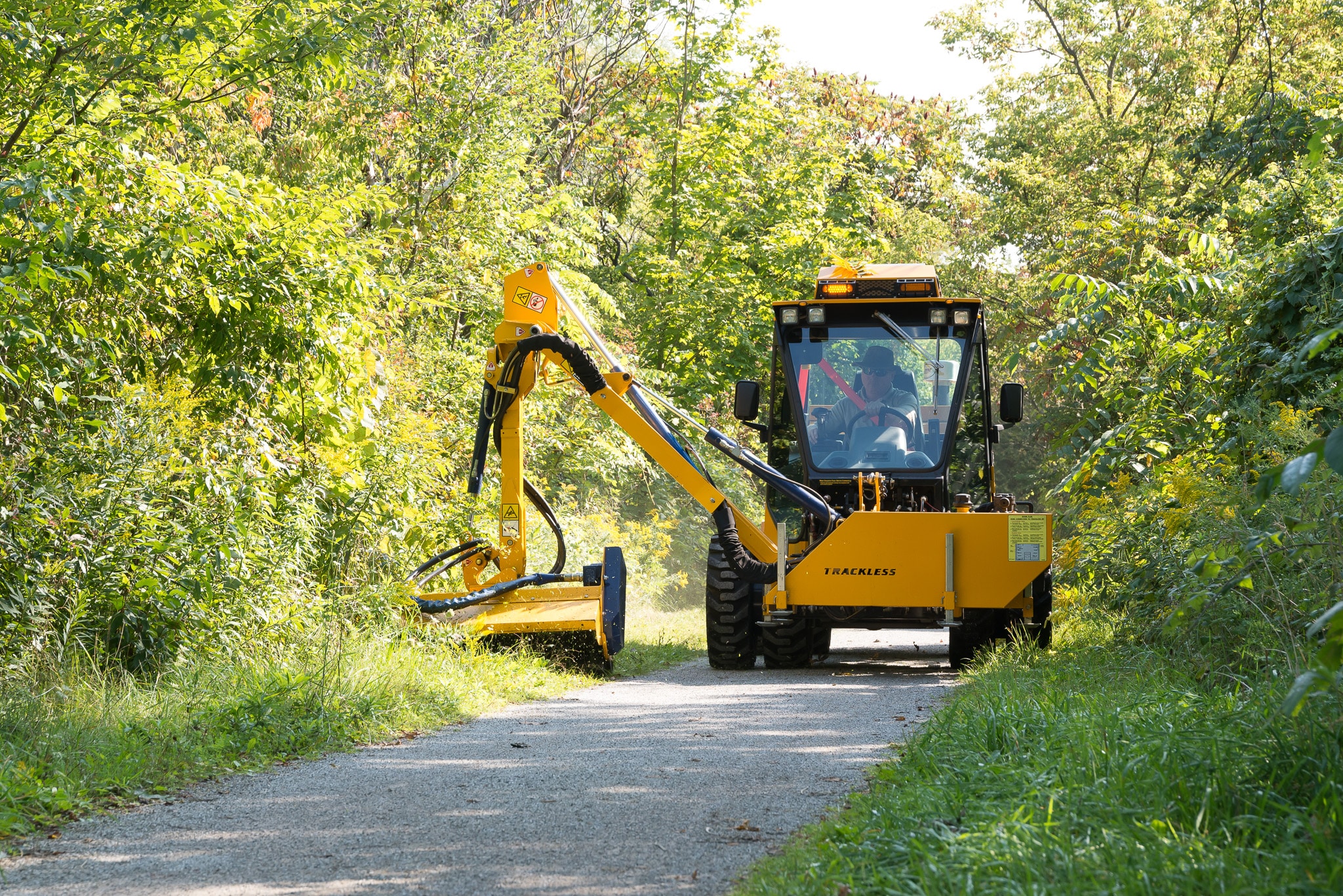 Above: The Trackless MT7 is equipped with a Boom Flail Mower, which maintains green spaces alongside a walking trail.