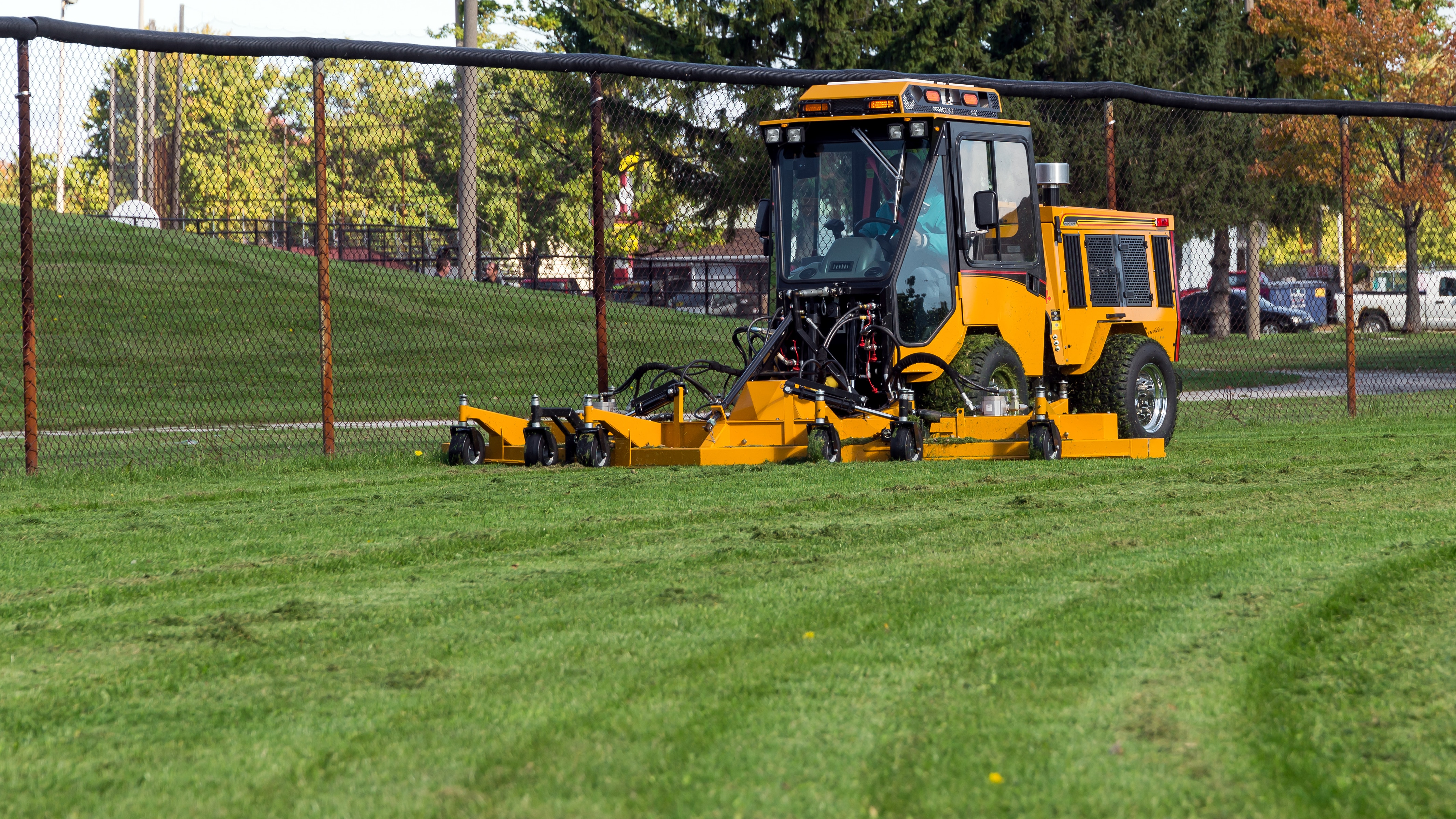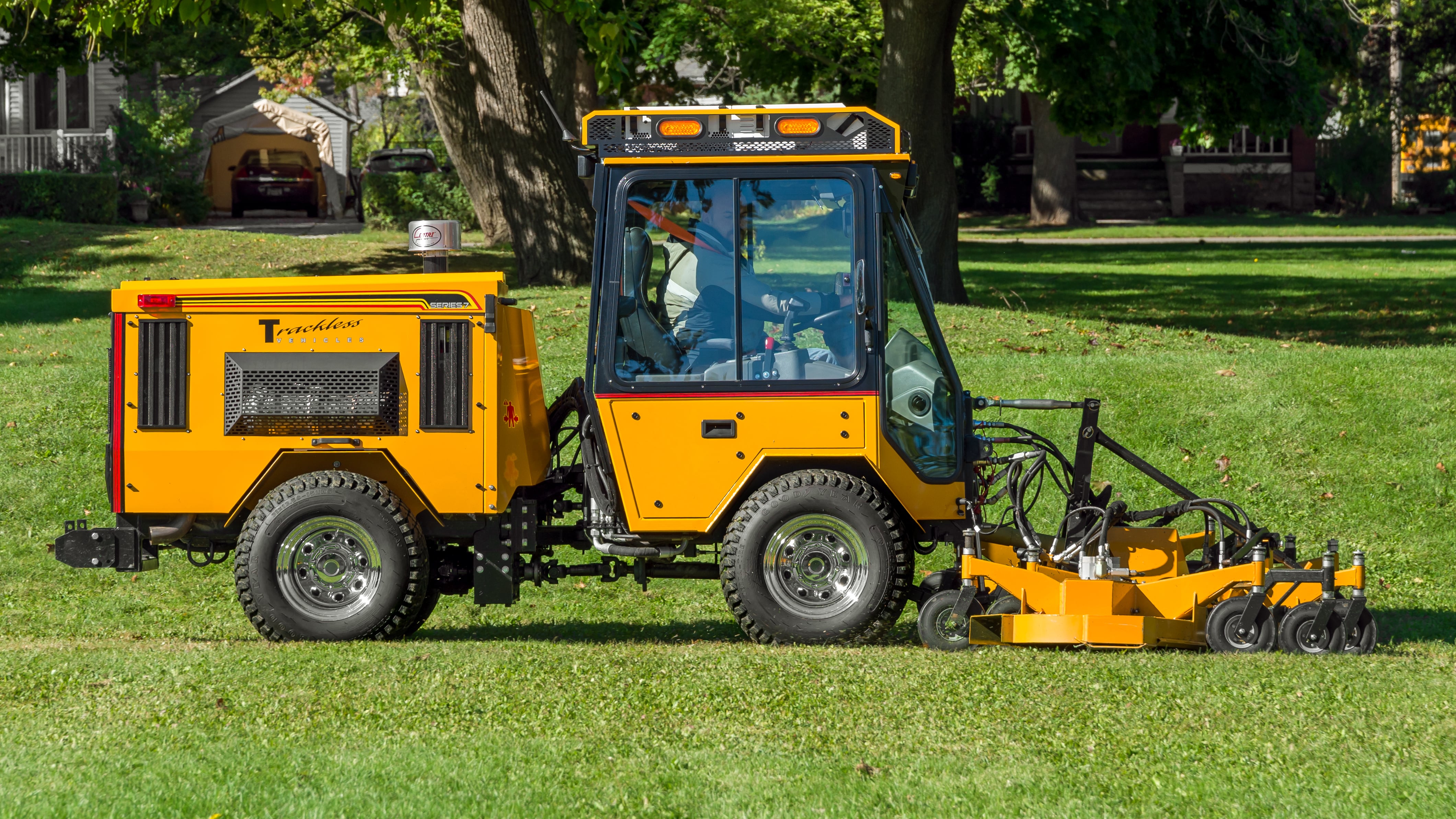 The 10′ and 14′ Rotary Finishing Mower was designed to drastically cut down mowing time on large areas such as campuses and parks. Uneven terrain requires flexibility in mowers to avoid scalping. Trackless solved this problem with a three-section, front-mounted mower comprised of a 72-inch three-spindle, PTO-driven center section with a hinged hydraulic-driven wing on each side. Separate valves control each hydraulic motor and lift cylinder. The MT7 has a built-in hydraulic system to power the right and left wings. Safety switches shut off the wings automatically when raised. For side slope cutting, axle extensions and terra grip turf tires are available.